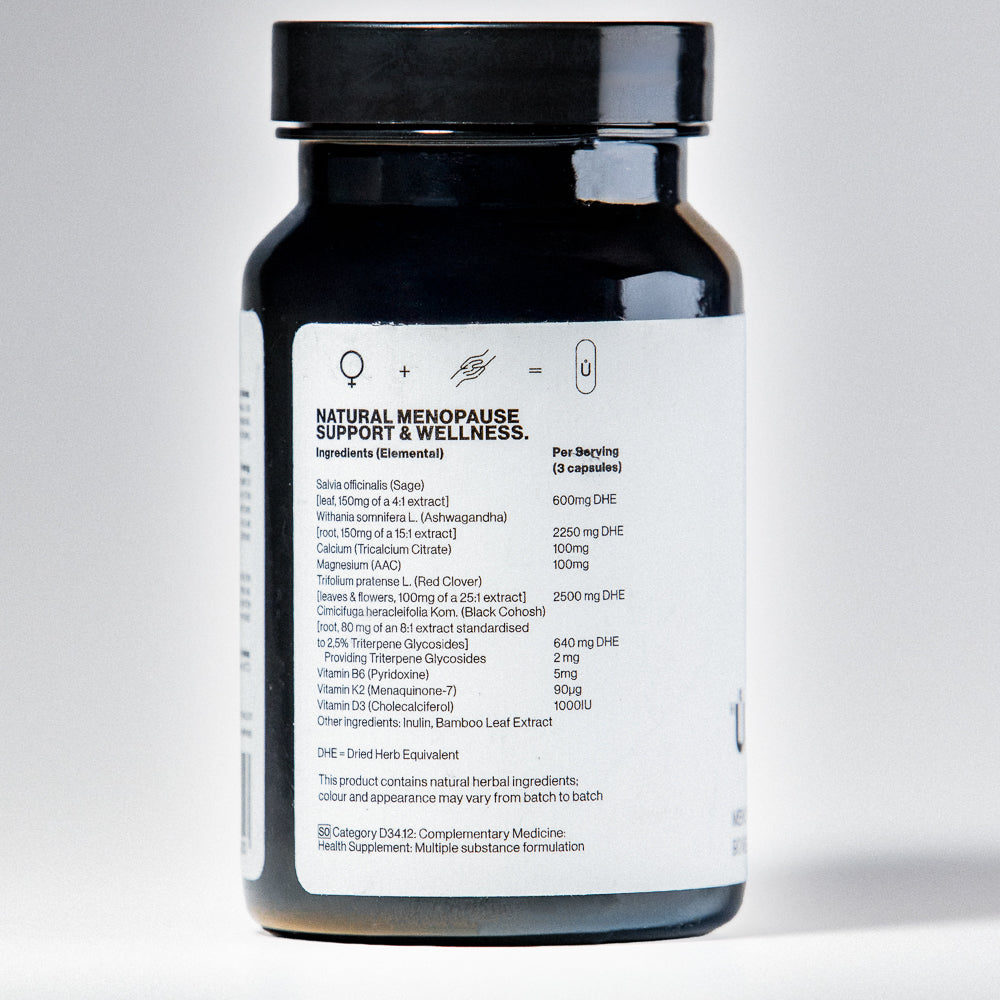 This thoughtful blend supports women through every stage of menopause. Black Cohosh and Red Clover help ease hot flashes and mood swings, while Sage supports natural cooling and hormone balance. Ashwagandha provides stress resilience, and Calcium, Magnesium, Vitamin D3, and Vitamin K2 work together to protect bone health. Vitamin B6 aids energy and mood, helping you feel balanced, strong, and supported.